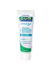 Gum Gingidex Dentifrice 75 ml grâce à son système double action anti-plaque, permet une meilleure santé des gencives. Ce dentifrice agit en prévention quotidienne pour : - aider à soulager les gencives fragilisées,- aider à réduire l'accumulation de la plaque, - contribuer au maintien de tissus gingivaux sains, - aider à maintenir des dents fortes et en bonne santé.Conseillé dès les premiers signes de gencives sensibles, il l'est aussi lors de soins orthodontiques, implantologiques ou de port de prothèse.Sa formule contient du digluconate de chlorhexidine pour maintenir les gencives en bonne santé, et du chlorure de cétylpyridinium pour neutraliser les toxines libérées par la plaque bactérienne. Il contient aussi :- de la vitamine E : anti-oxydant aidant à lutter contre le vieillissement cellulaire,- de l'aloe vera : hydratant et soulageant les gencives irritées,- de la pro-vitamine B5 : pour apporter fermeté et tonicité aux gencives,- du fluor : pour maintenir l'email dentaire solide et sain.