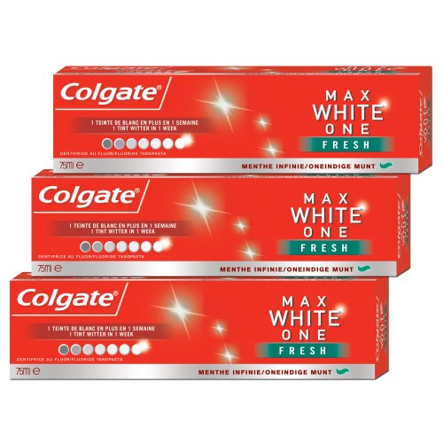 - Colgate MaxWhite One Fresh avec micro-cristaux accélérateurs de blancheur enlève les tâches en douceur et prévient la formation du tartre pour vous aider à obtenir des dents plus blanches d'une teinte en une semaine*. De plus ses agents fraîcheur uniques vous procurent une intense sensation de fraîcheur lors du brossage.