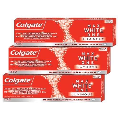- Le gel moussant Smartfoam de Colgate MaxWhite One Luminous se transforme en une mousse pour nettoyer parfaitement votre bouche, même entre vos dents. De plus, ses agents blanchissants sont libérés pour envelopper vos dents de blancheur.