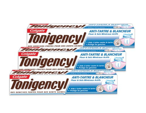 Contenu du packaging : 3 x 75 ml Colgate Tonigencyl Anti-Tarte et Blancheur Dentifrice 75 ml Des gencives fortes pour des dents saines Aide à lutter c